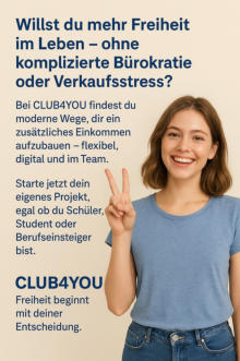 C4You ist ein ganz einfaches Gemeinschaftsprojekt.Du spendest 3 Menschen jeweils 10 Euro. Jeden Monat. Nur das. Mehr nicht.Von jedem, der nach Dir kommt, bekommst Du 10 Euro.Voraussetzung für ein erfolgreiches Gelingen ist, dass jeder mindestens eine weitere Person kennt.Es ist also ein reines Teamaufbau-Projekt.Es ist steuerbefreit und vom Finanzamt geprüft und genehmigt. Es läuft seit 8 Jahren stabil.Was Du mit Deinen Einnahmen machst, bestimmst Du selbst.Manche fördern damit ihre eigenen Projekte.Oder legen das Geld für später an die Seite.Manche unterstützen damit öffentliche Tierschutzprojekte.Beispiele dazu gibt es in der Telegramgruppe.Wenn Dich das interessiert, dann findest Du hier mehr Informationen.In sehr vielen Sprachen verfügbar. Also weltweit ausbaubar.https://www.club4you.net/1760625585https://sites.google.com/view/c4you-spendenblog-176062558